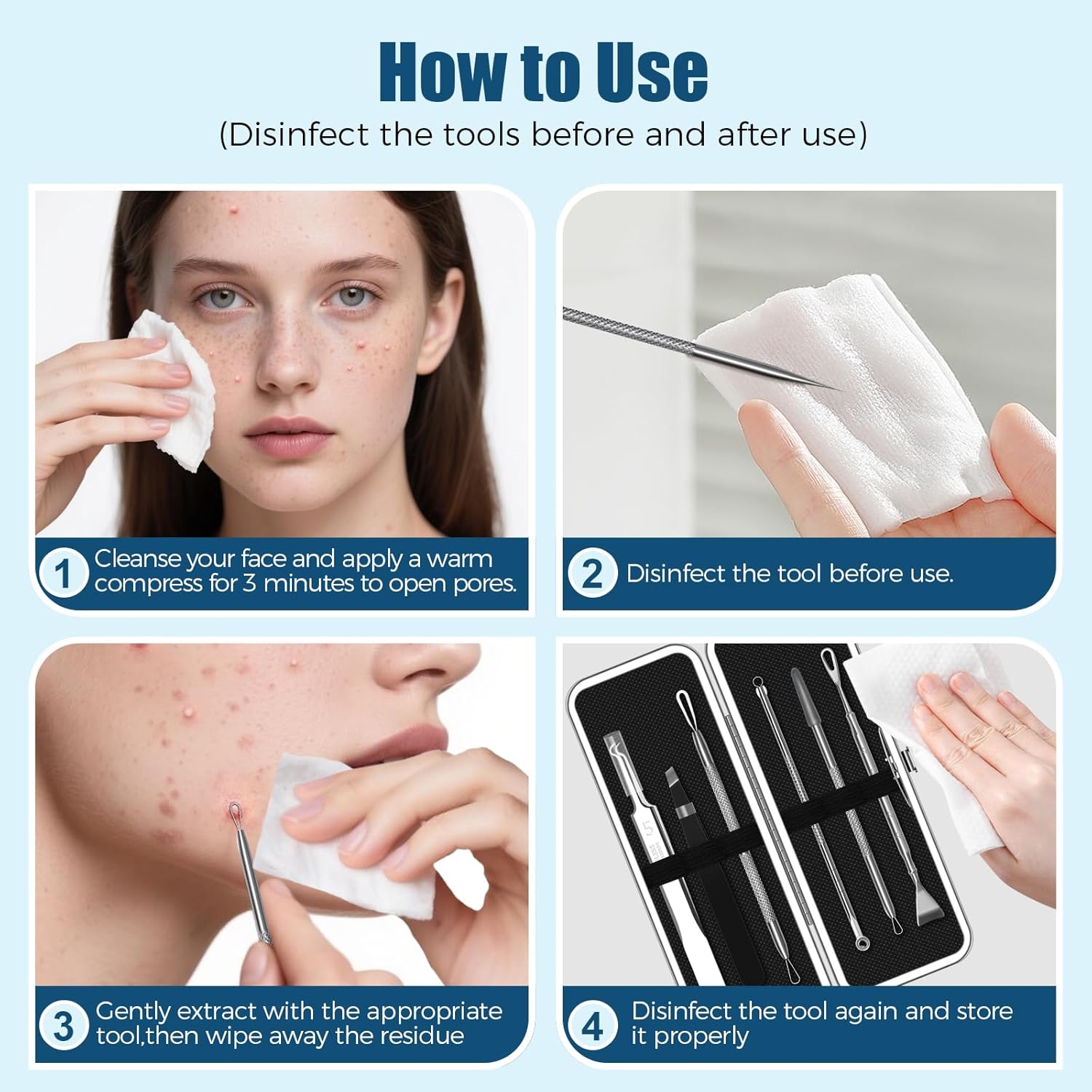 Precaution: Use the blackhead remover only when the acne is fully matured. Clean all tools thoroughly before and after each use with a disinfecting solution
