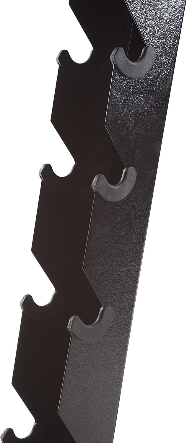 CONSTRUCTION – A-frame dumbbell rack is built with heavy-gauge steel tubing and finished with a durable black powder coat for long-lasting performance