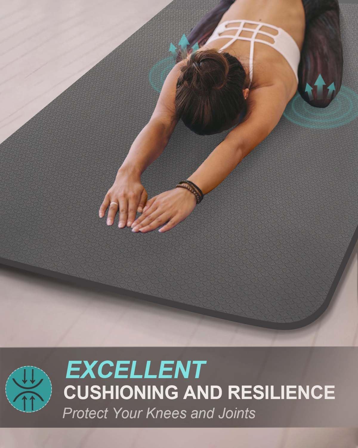 WIDER AND LONGER FOR MORE SPACE — Longer and wider than regular yoga mats, ideal almost for everyone. Comes with a dual-use strap, which can use as a yoga mat carry strap, or as a yoga stretching strap.