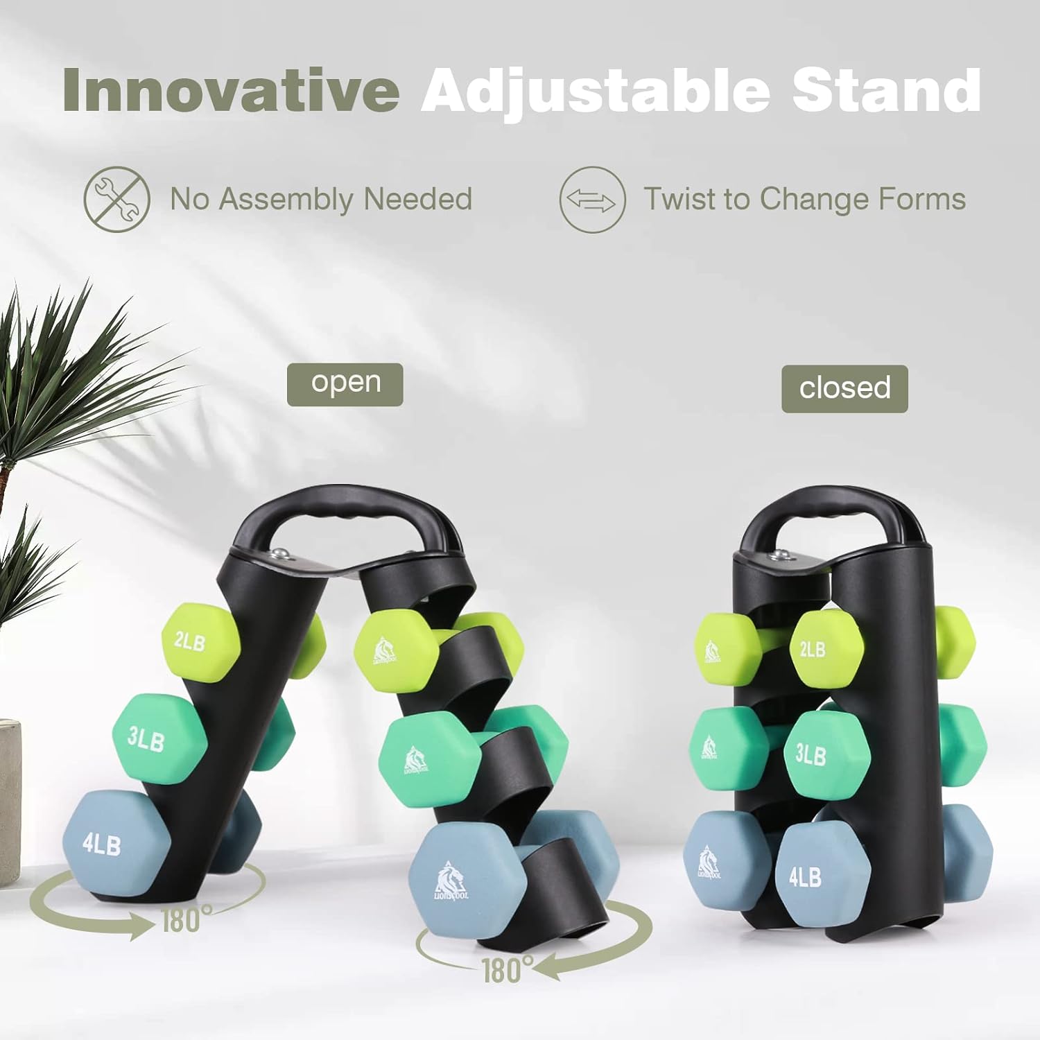 Creative Portable Multifunctional Dumbbell Rack: No assembly needed. Innovative design for easily switch between A-frame and H-frame by rotating the rack frames. Maximize your space in H-shape and take out dumbbells easily in A-shape. You can also do kettlebell workouts with all the dumbbells on it in H-shape. Ergonomic handle for easy carrying the whole set anywhere.